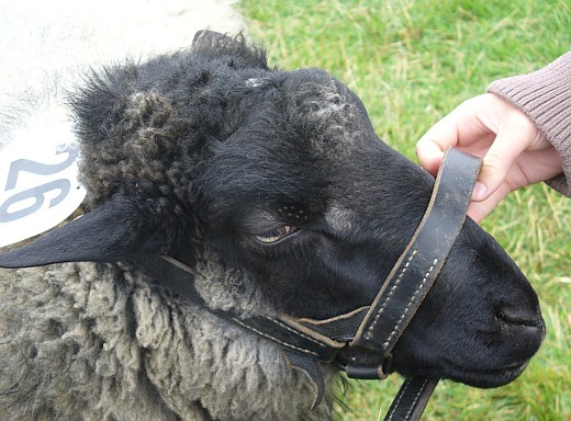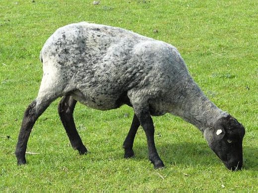 Diese extreme Mähnenbildung beim Mutterschaf ist unerwünscht, zudem das Mehlmaul und die weiße Augenbraue scheinen das Tier nicht zu qualifizieren. Dennoch sind gerade diese Ausreißer typisch für das RPL. Die vermeintliche Stuhlbeinigkeit ist i. d. Realität nicht vorhanden. Allerdings hat sich bei diesem massigen Tier im Laufe der Jahre eine durchtrittige Hinterfessel entwickelt.