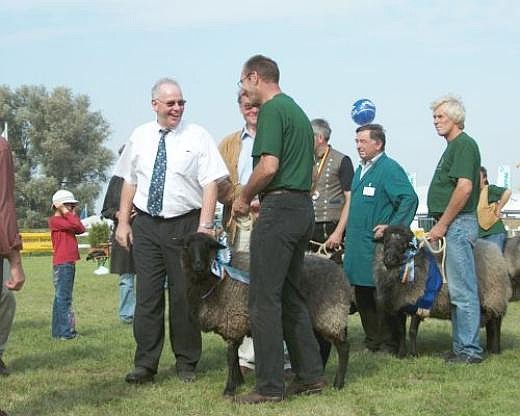 Robert von Stärk am Pommernschaf mit Minister Till Backhaus.